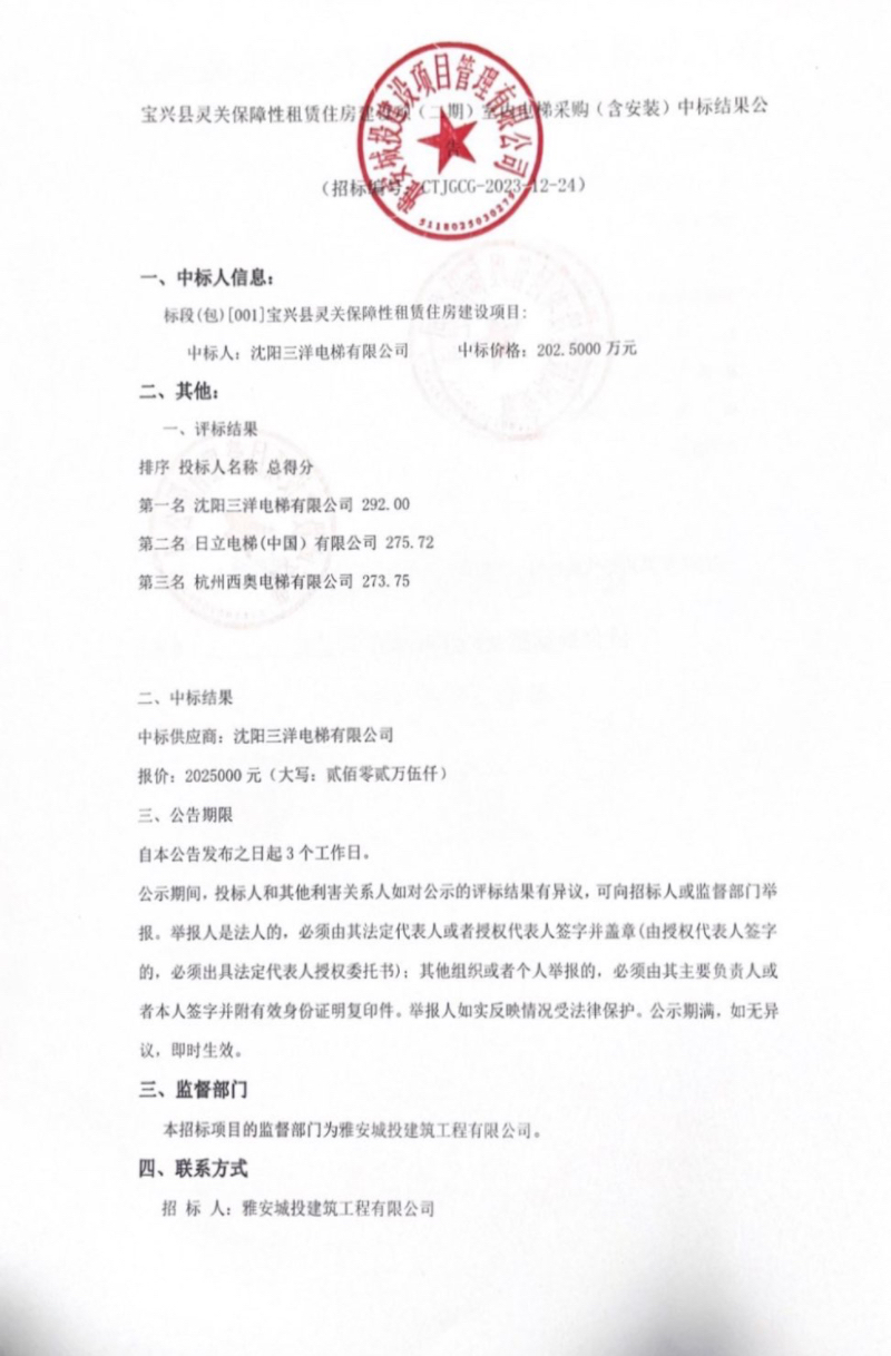 寶興縣靈關保障性租賃住房建設項目(二期)室內電梯采購(含安裝)中標結果公示