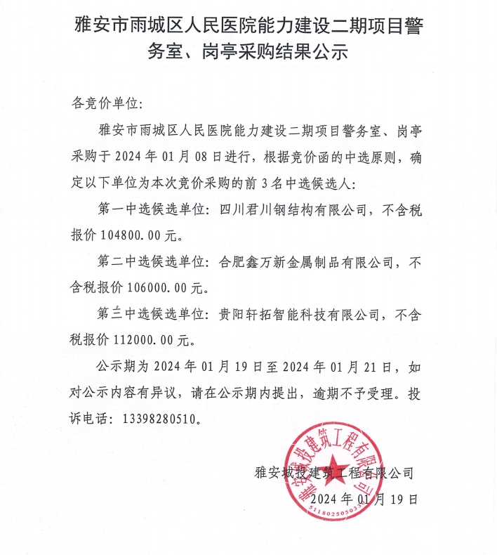雅安市雨城區(qū)人民醫(yī)院能力建設(shè)二期項目警務(wù)室、崗?fù)げ少徑Y(jié)果公示