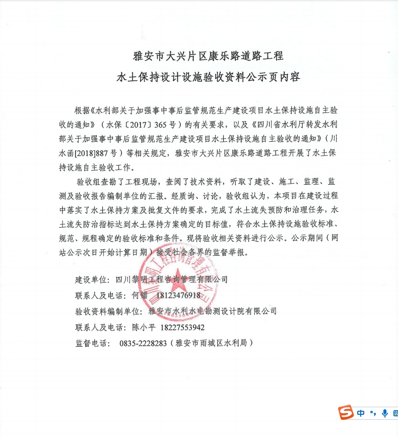 雅安市大興片區(qū)康樂路道路工程水土保持設(shè)計(jì)設(shè)施驗(yàn)收資料公示頁(yè)內(nèi)容