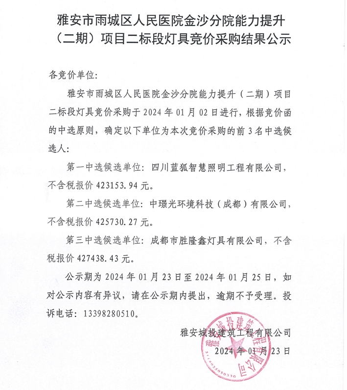 雅安市雨城區(qū)人民醫(yī)院金沙分院能力提升(二期)項目二標(biāo)段燈具競價采購結(jié)果公示
