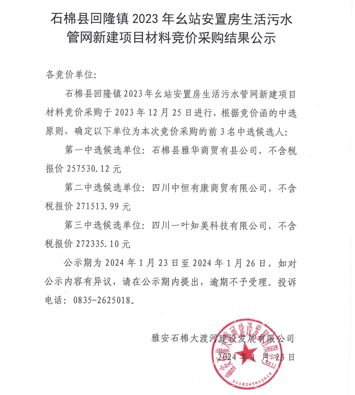 石棉縣回隆鎮(zhèn)2023年幺站安置房生活污水管網(wǎng)新建項目材料競價采購結果公示