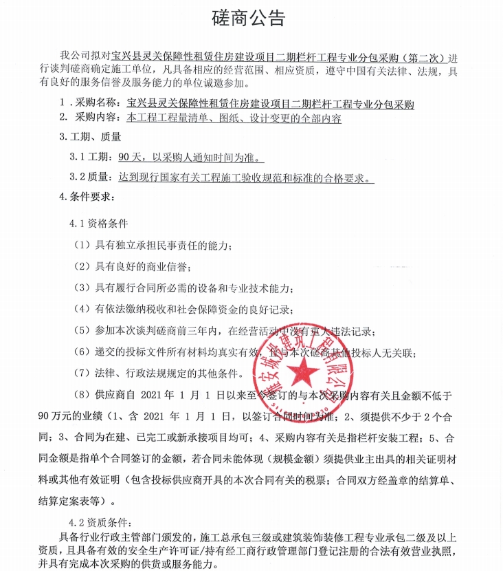 寶興縣靈關(guān)保障性租賃住房建設(shè)項目二期欄桿工程專業(yè)分包采購(第二次)磋商公告