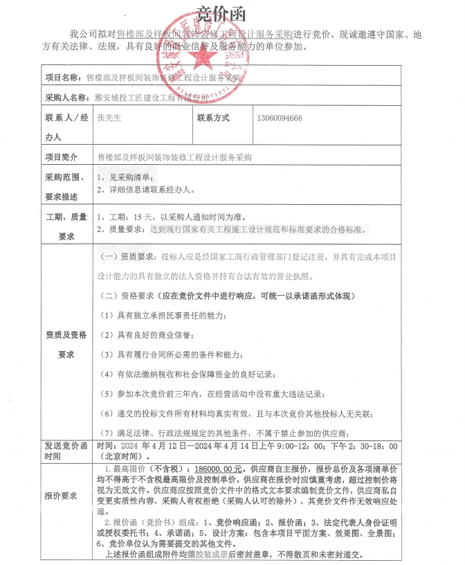售樓部及樣板間裝飾裝修工程設(shè)計服務(wù)采購競價公告