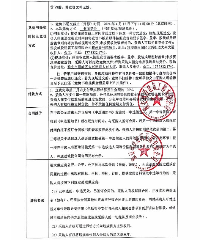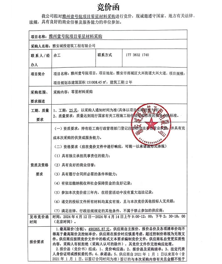 雅州壹號(hào)院項(xiàng)目零星材料采購競(jìng)價(jià)公告