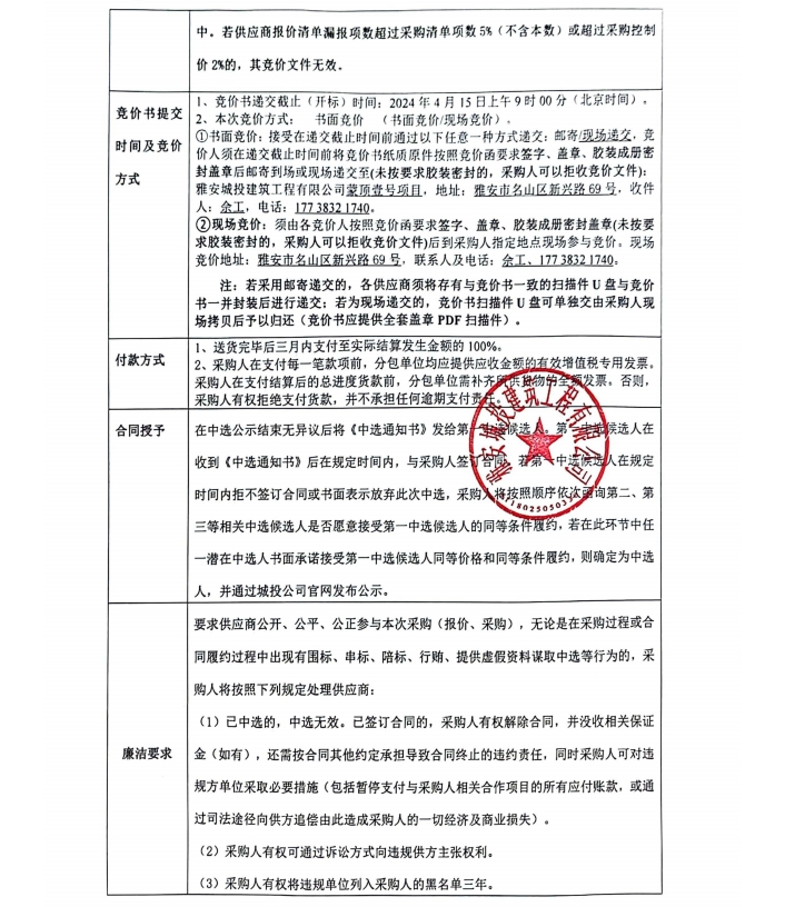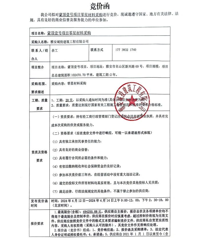 蒙頂壹號(hào)項(xiàng)目零星材料采購競(jìng)價(jià)公告