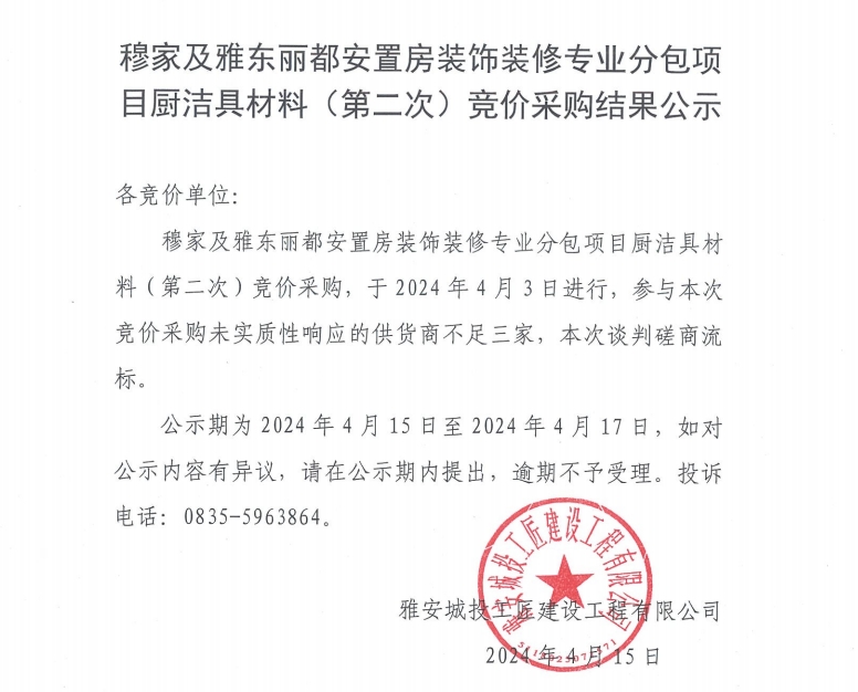 穆家及雅東麗都安置房裝飾裝修專業(yè)分包項(xiàng)目廚具材料(第二次)競(jìng)價(jià)采購(gòu)結(jié)果公示