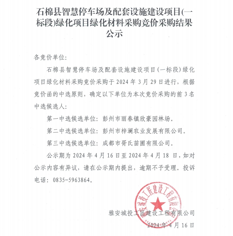 石棉縣智慧停車場(chǎng)及配套設(shè)施建設(shè)項(xiàng)目(一標(biāo)段)綠化項(xiàng)目綠化材料采購(gòu)競(jìng)價(jià)采購(gòu)結(jié)果公示