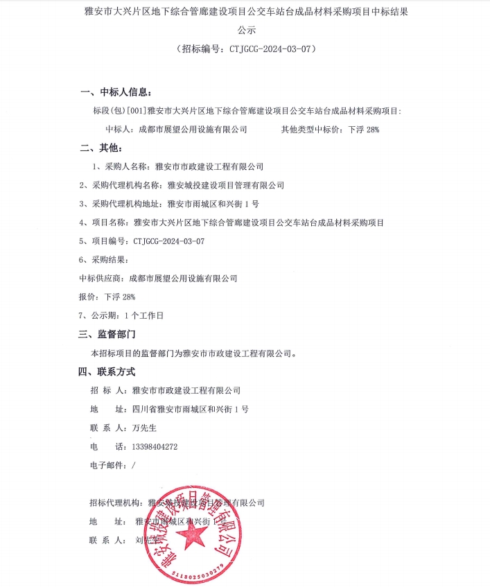 雅安市大興片區(qū)地下綜合管廊建設項目公交車站臺成品材料采購項目中標結果公示