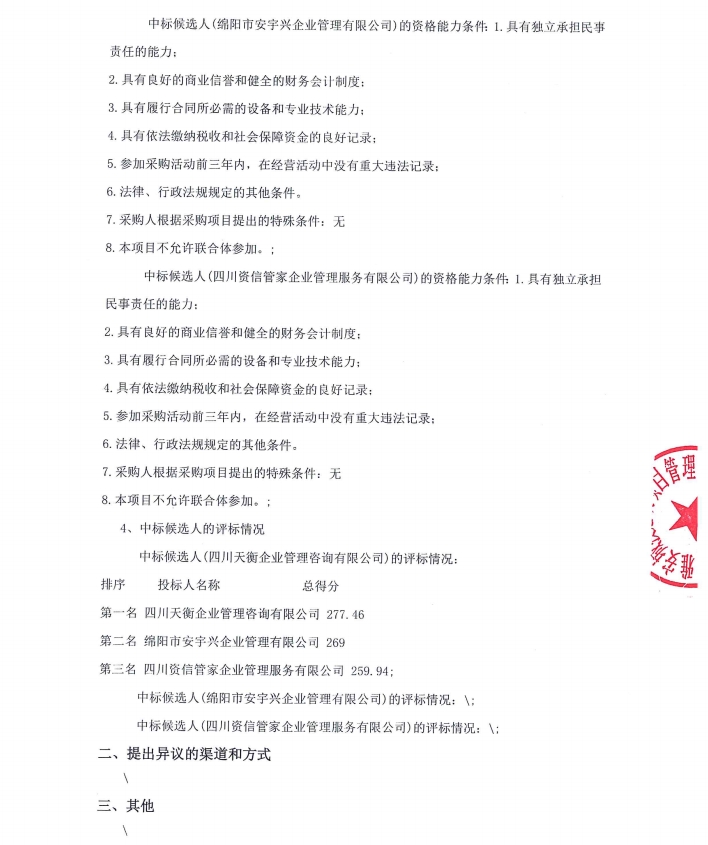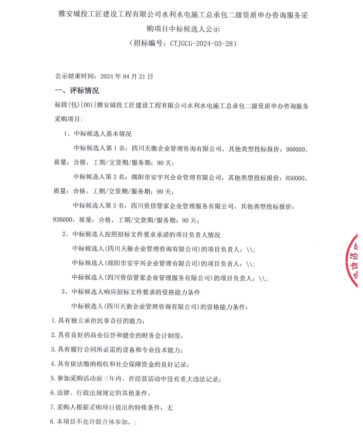 雅安城投工匠建設(shè)工程有限公司水利水電施工總承包二級(jí)資質(zhì)申辦咨詢(xún)服務(wù)采購(gòu)項(xiàng)目中標(biāo)候選人公示