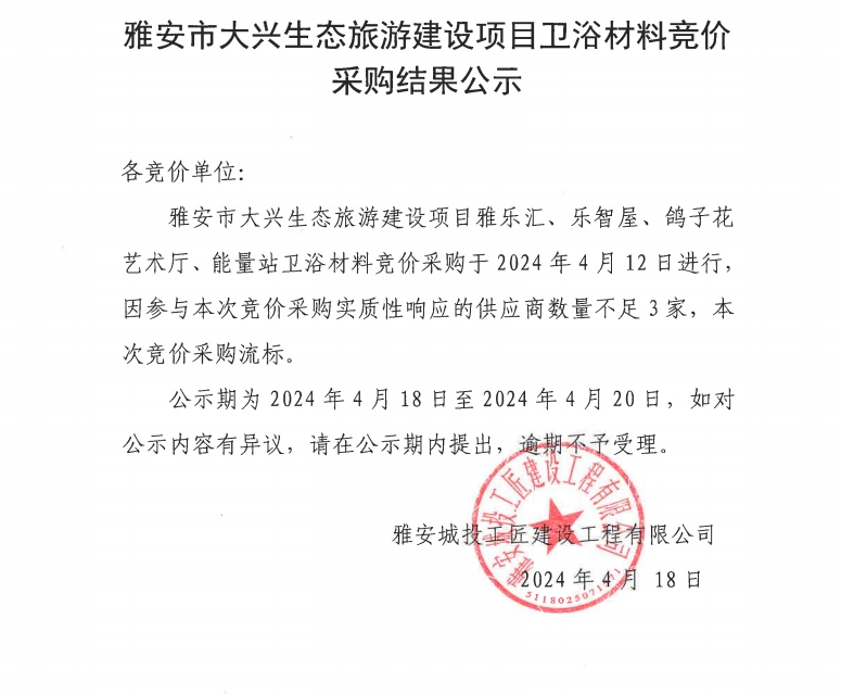 雅安市大興生態(tài)旅游建設(shè)項(xiàng)目衛(wèi)浴材料競(jìng)價(jià)采購結(jié)果公示