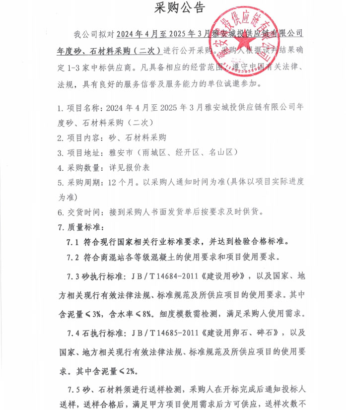 2024年4月至2025年3月雅安城投供應(yīng)鏈有限公司年度砂、石材料采購(第二次)公告