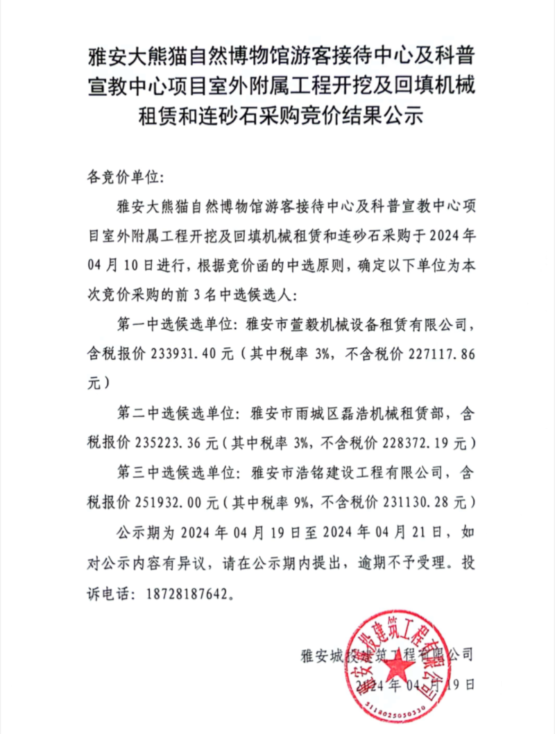雅安大熊貓自然博物館游客接待中心及科普宣教中心項目室外附屬工程開挖及回填機械租賃和連砂石采購競價結(jié)果公示