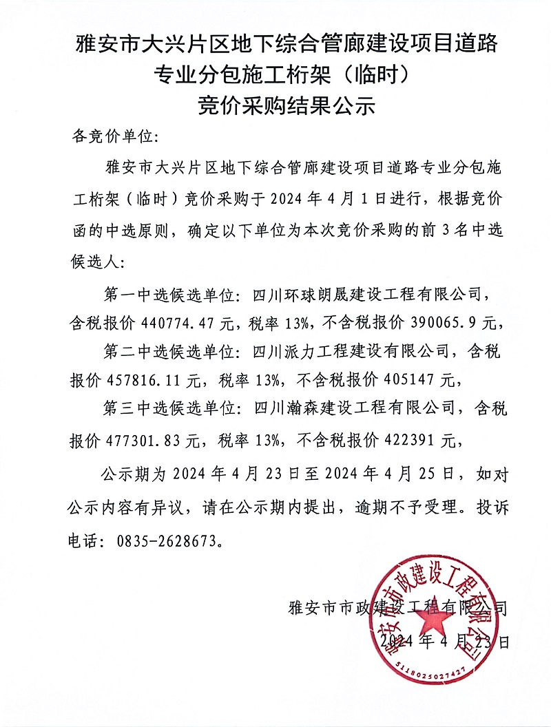 雅安市大興片區(qū)地下綜合管廊建設項目道路專業(yè)分包施工桁架(臨時)競價采購結果公示