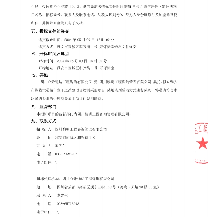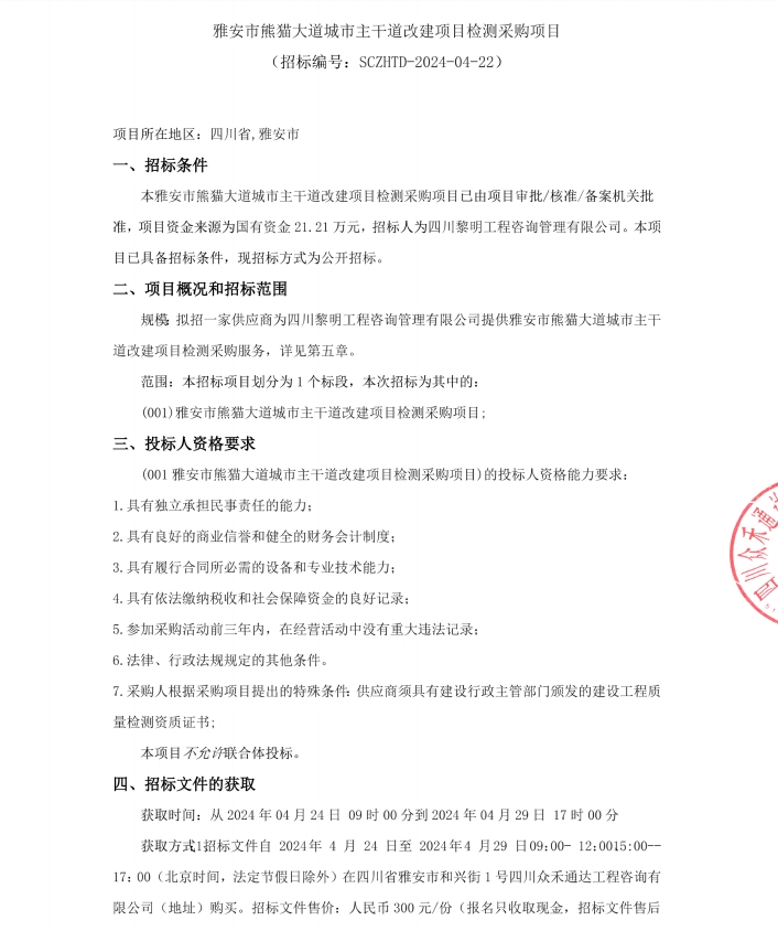 雅安市熊貓大道城市主干道改造項目檢測采購項目公告