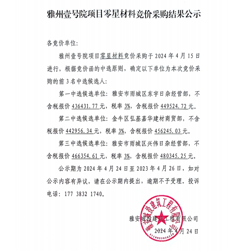 雅州壹號院項(xiàng)目零星材料競價(jià)采購結(jié)果公示