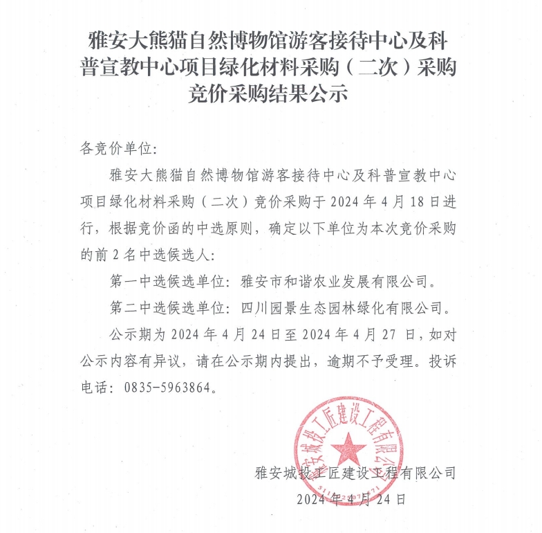 雅安大熊貓自然博物館游客接待中心及科普宣教中心項(xiàng)目綠化材料采購(二次)競價采購結(jié)果公示