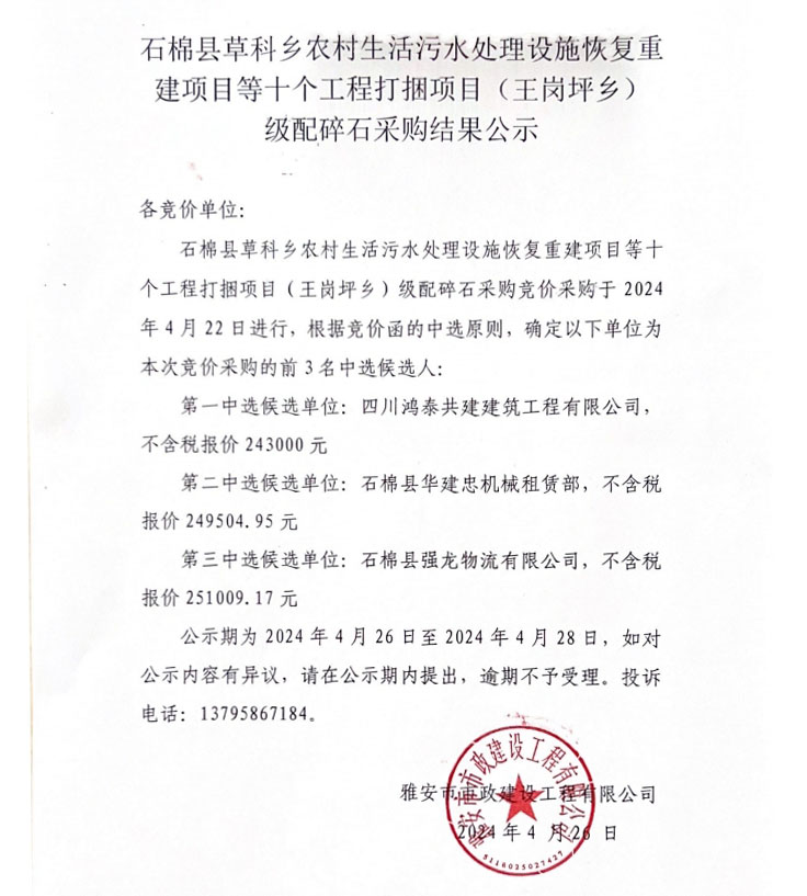 石棉縣草科鄉(xiāng)農(nóng)村生活污水處理設(shè)施恢復(fù)重建項(xiàng)目等十個(gè)工程打捆項(xiàng)目(王崗坪鄉(xiāng))級配碎石采購結(jié)果公示