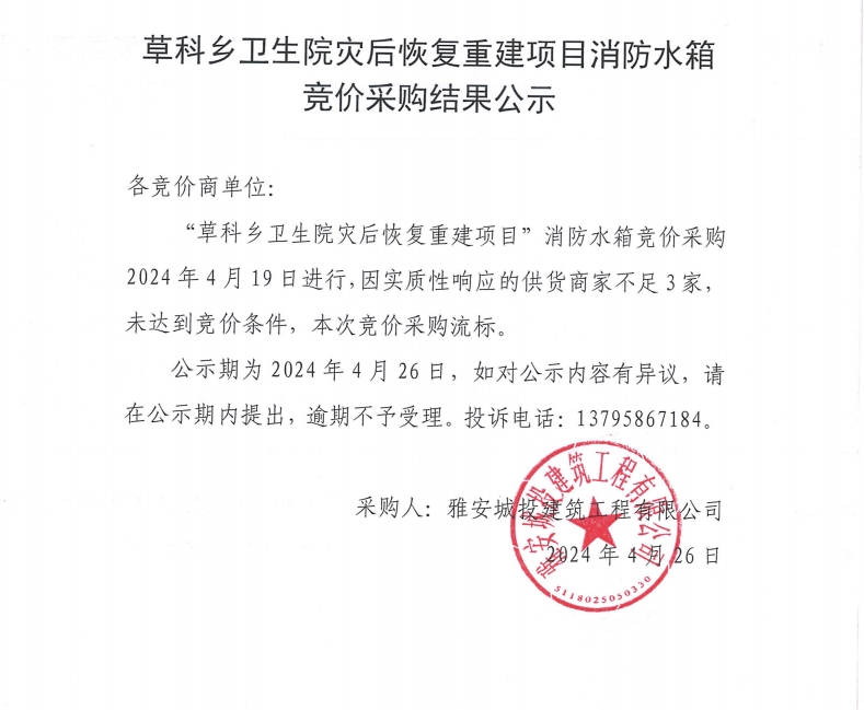 草科鄉(xiāng)衛(wèi)生院災(zāi)后恢復重建項目消防水箱競價采購結(jié)果公示