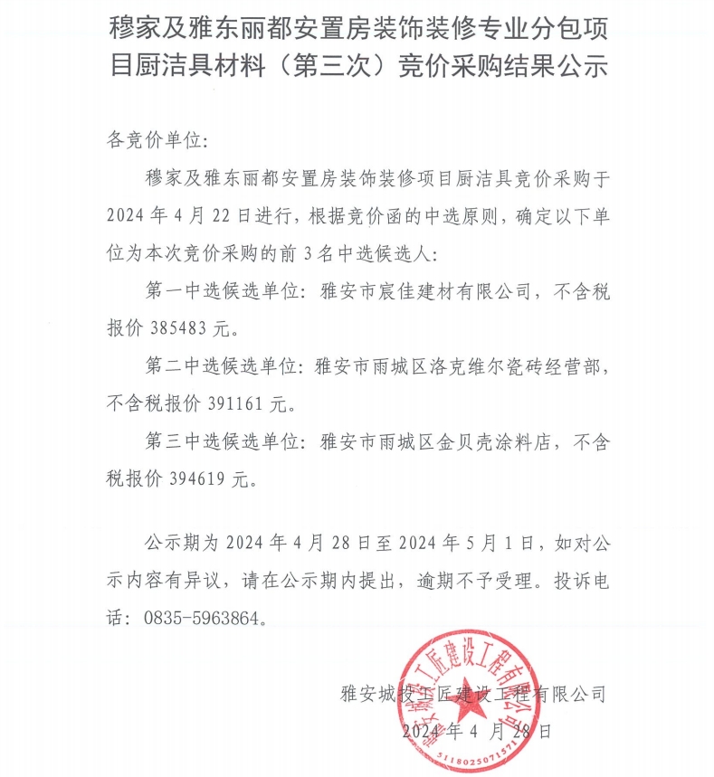 穆家及雅東麗都安置房裝飾裝修專業(yè)分包項(xiàng)目潔具材料(第三次)競價(jià)采購結(jié)果公示