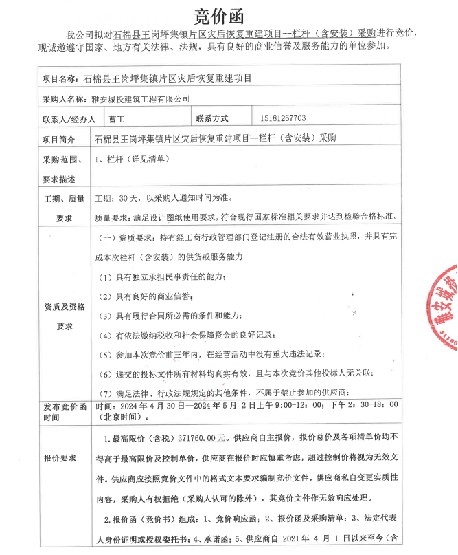 石棉縣王崗坪集鎮(zhèn)片區(qū)災(zāi)后恢復(fù)重建項(xiàng)目--欄桿(含安裝)采購競價(jià)公告