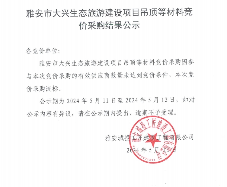 雅安市大興生態(tài)旅游建設(shè)項(xiàng)目吊頂?shù)炔牧细?jìng)價(jià)采購(gòu)結(jié)果公示
