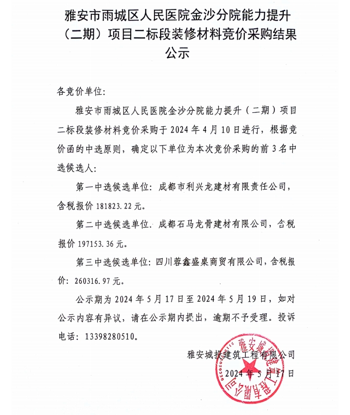 雅安市雨城區(qū)人民醫(yī)院金沙分院能力提升(二期)項(xiàng)目二標(biāo)段裝修材料競價采購結(jié)果公示