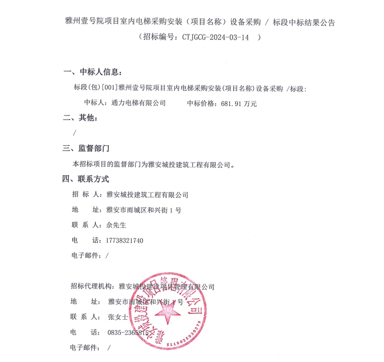 雅州壹號(hào)院項(xiàng)目室內(nèi)電梯采購安裝(項(xiàng)目名稱)設(shè)備采購/標(biāo)段中標(biāo)結(jié)果公告