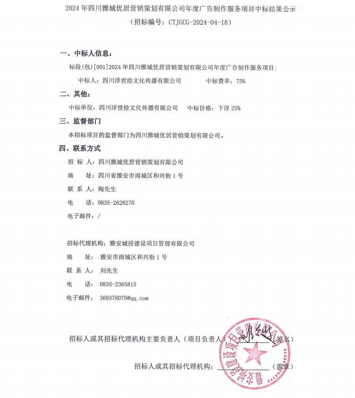 2024年四川雅城優(yōu)居營銷策劃有限公司年度廣告制作服務項目中標結果公示