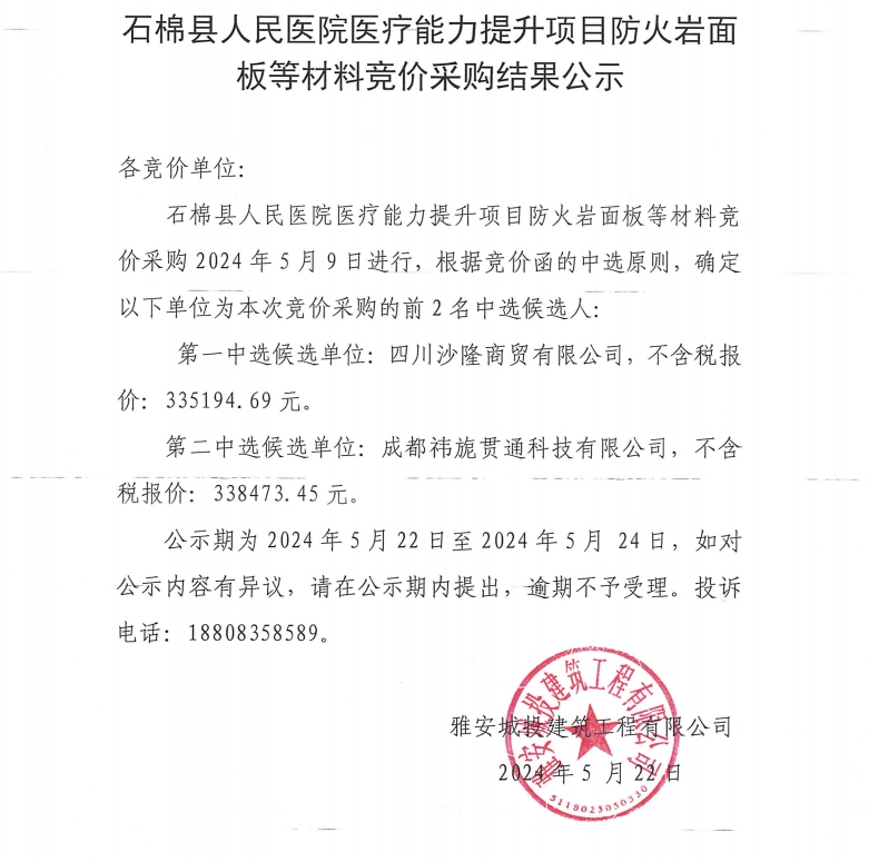 石棉縣人民醫(yī)院醫(yī)療能力提升項目防火巖面板等材料競價采購結(jié)果公示