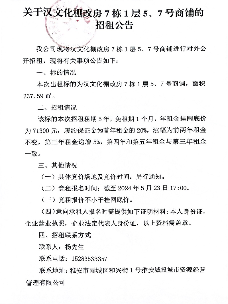 關(guān)于漢文化棚改房7棟1層5、7號(hào)商鋪的招租公告