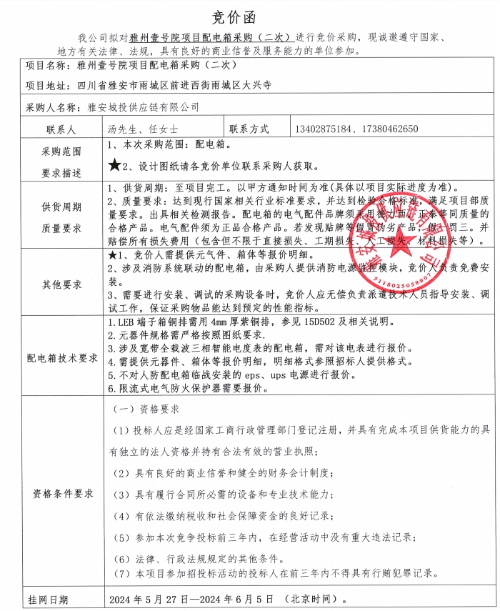 雅州壹號院項目配電箱采購(二次)競價公告