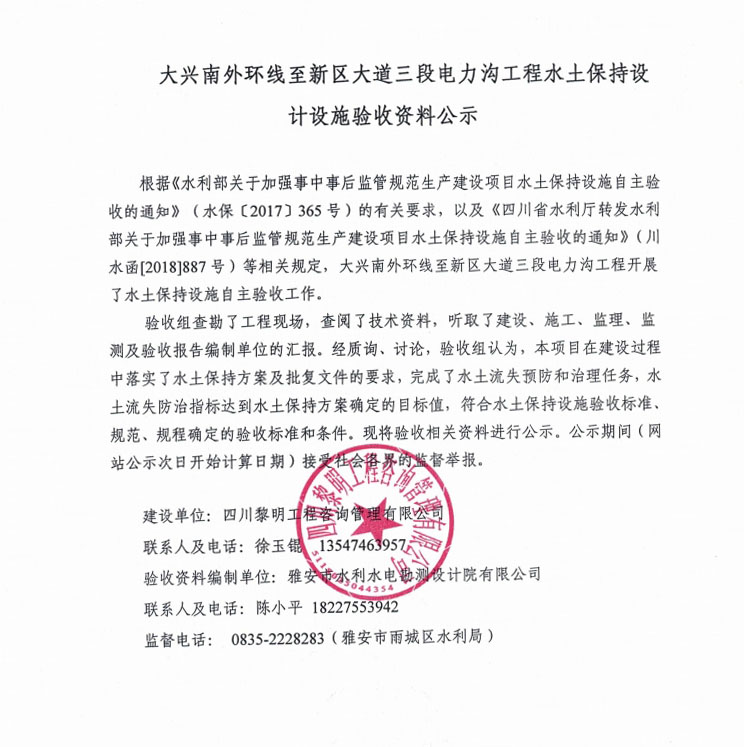 大興南外環(huán)線至新區(qū)大道三段電力溝工程水土保持設(shè)計(jì)設(shè)施驗(yàn)收資料公示