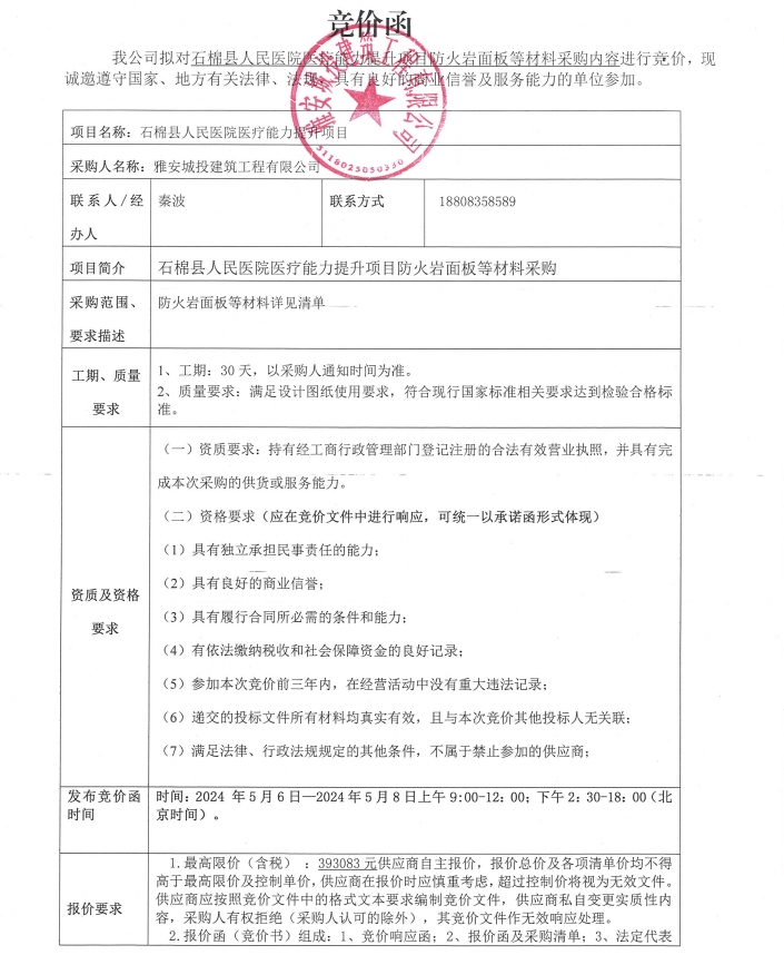 石棉縣人民醫(yī)院醫(yī)療能力提升項(xiàng)目防火巖面板等材料采購內(nèi)容競(jìng)價(jià)公告