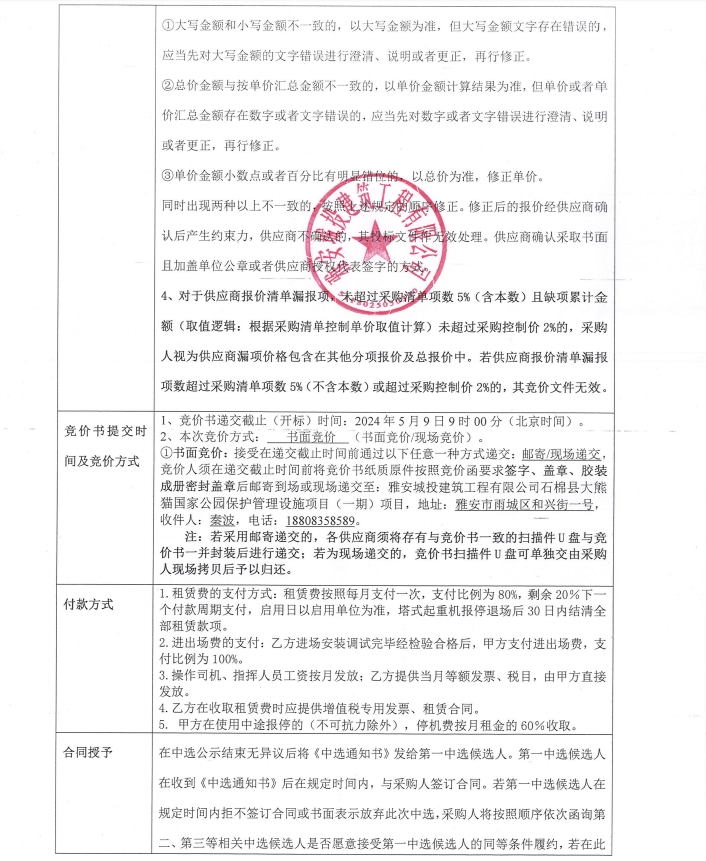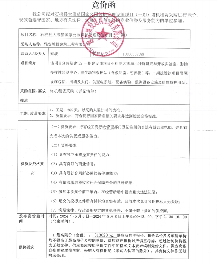 石棉縣大熊貓國家公園保護管理設(shè)施項目(一期)塔機租賃采購競價公告