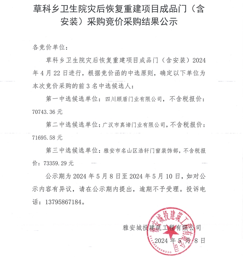 草科鄉(xiāng)衛(wèi)生院災(zāi)后恢復(fù)重建項(xiàng)目成品門(mén)(含安裝)采購(gòu)競(jìng)價(jià)采購(gòu)結(jié)果公示