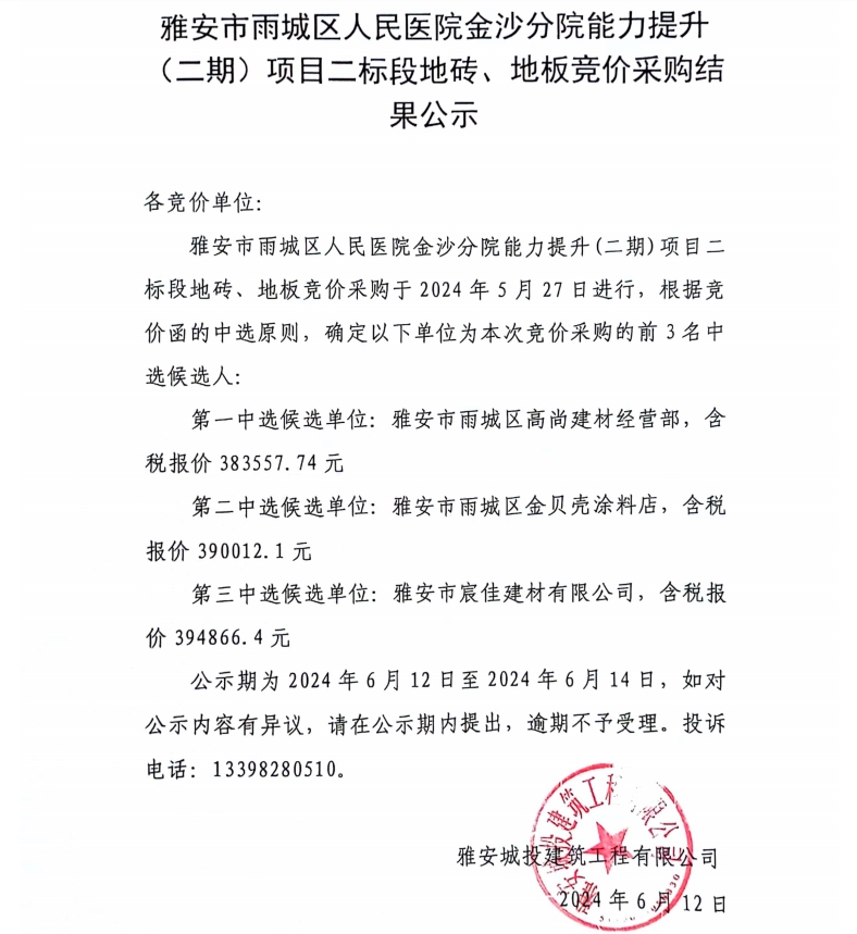 雅安市雨城區(qū)人民醫(yī)院金沙分院能力提升(二期)項目二標(biāo)段地磚、地板競價采購結(jié)果公示