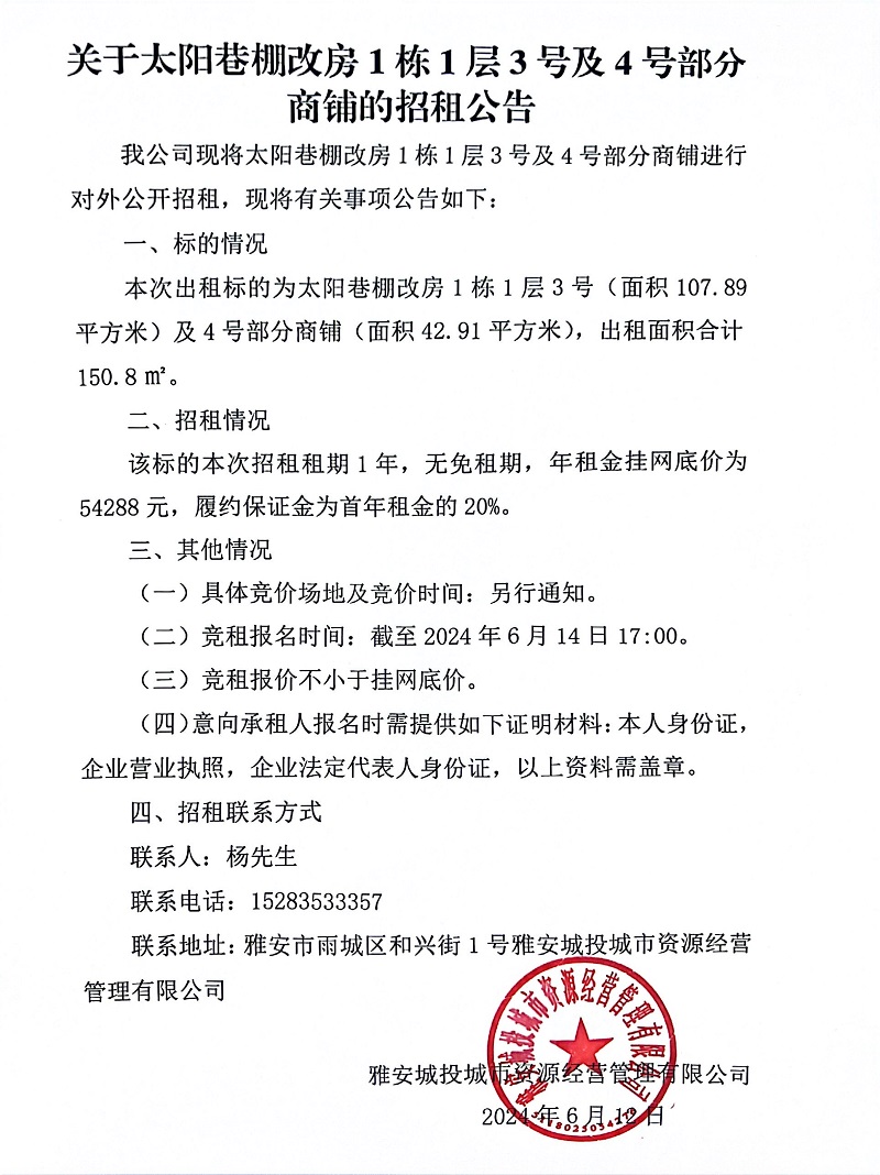 關(guān)于太陽巷棚改房1棟1層3號及4號部分商鋪的招租公告