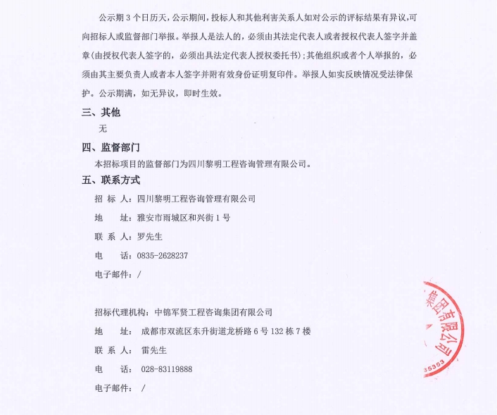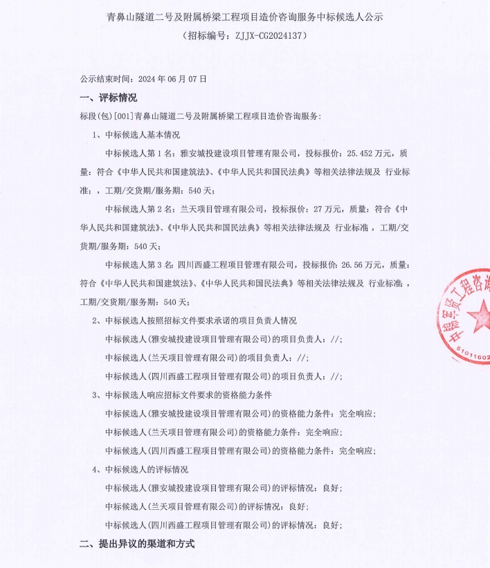 青鼻山隧道二號及附屬橋梁工程項目造價咨詢服務中標候選人公示