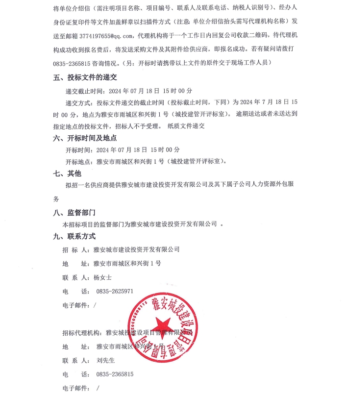 雅安城市建設(shè)投資開(kāi)發(fā)有限公司及其下屬子公司人力資源外包服務(wù)項(xiàng)目公告