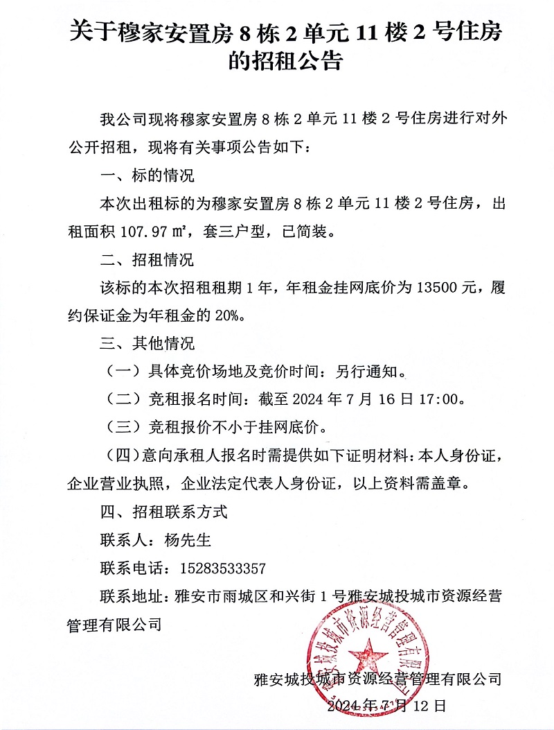 關(guān)于穆家安置房8棟2單元11樓2號住房的招租公告