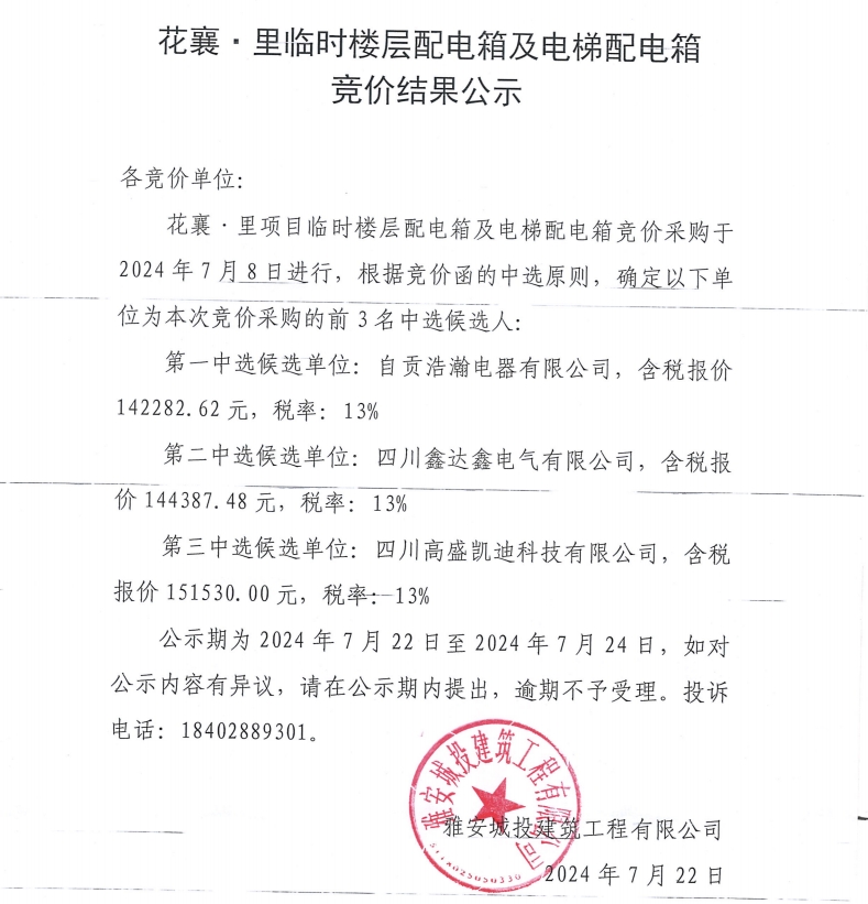 花襄·里臨時樓層配電箱及電梯配電箱競價結果公示