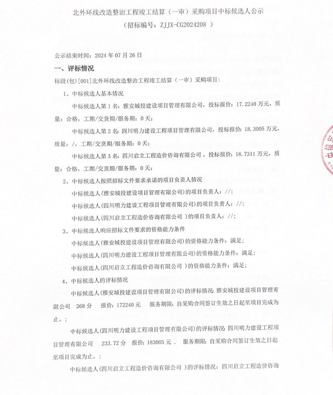 北外環(huán)線改造整治工程竣工結(jié)算(一審)采購項目中標候選人公示