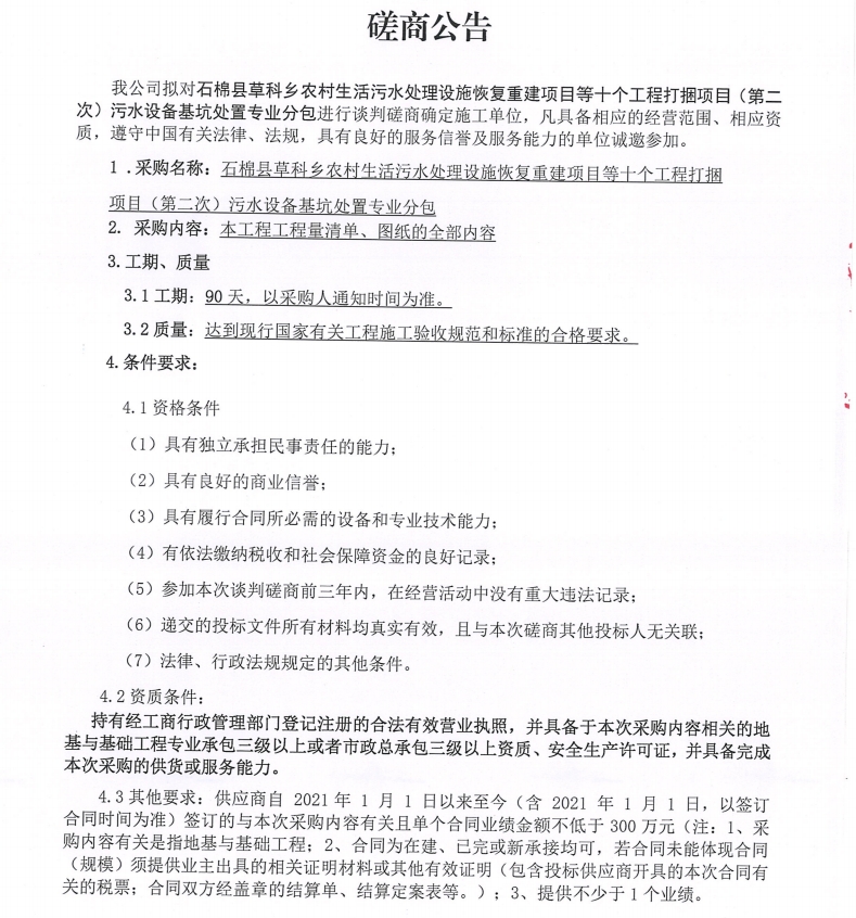 石棉縣草科鄉(xiāng)農(nóng)村生活污水處理設(shè)施恢復(fù)重建項(xiàng)目等十個(gè)工程打捆項(xiàng)目(第二次) 污水設(shè)備基坑處置專業(yè)分包采購談判磋商公告