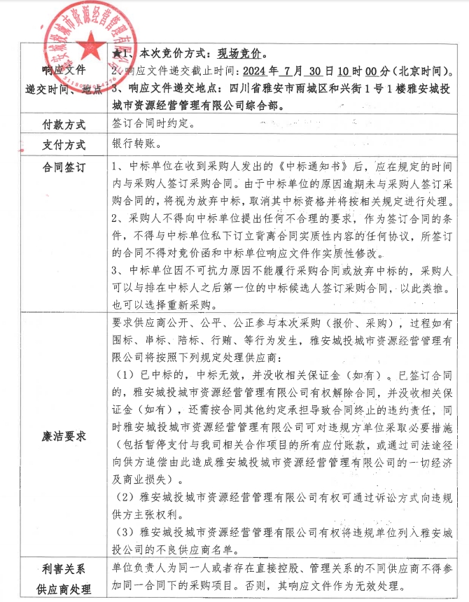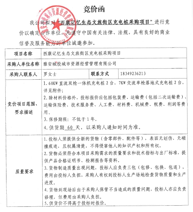 雅安城投城市資源經(jīng)營管理有限公司西康記憶生態(tài)文旅街區(qū)充電樁采購項目競價公告