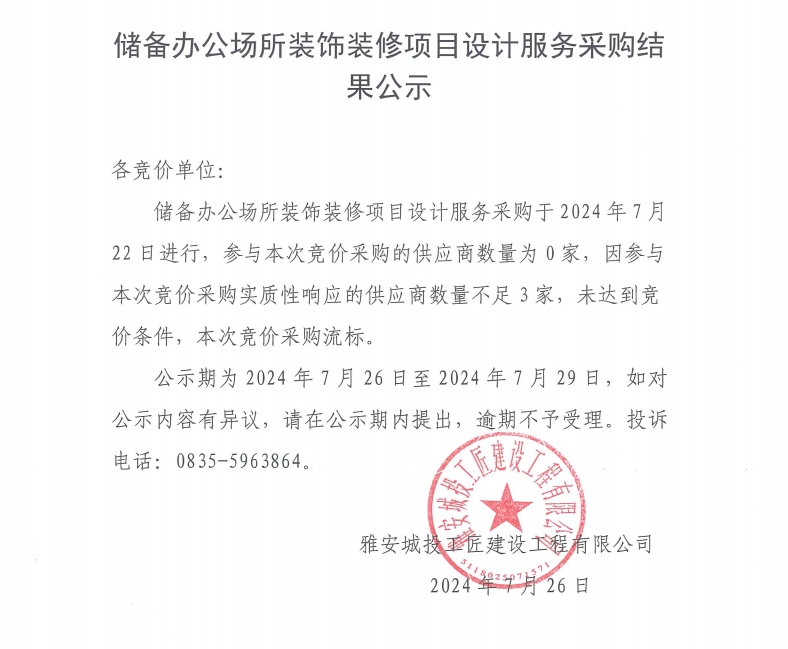 儲備辦公場所裝飾裝修項目設(shè)計服務(wù)采購結(jié)果公示