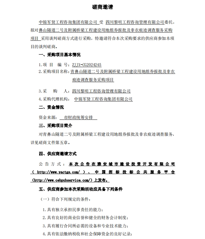 青鼻山隧道二號(hào)及附屬橋梁工程項(xiàng)目用地組劵報(bào)批及非農(nóng)痕跡調(diào)查服務(wù)采購(gòu)項(xiàng)目磋商邀請(qǐng)公告