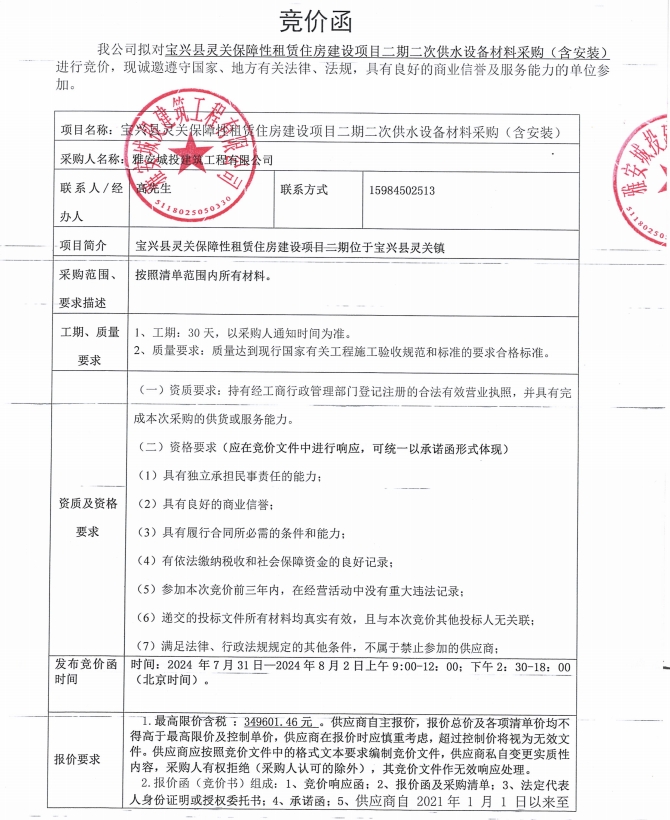 寶興縣靈關(guān)保障性租賃住房建設(shè)項(xiàng)目二期二次供水設(shè)備采購(含安裝)競價公告