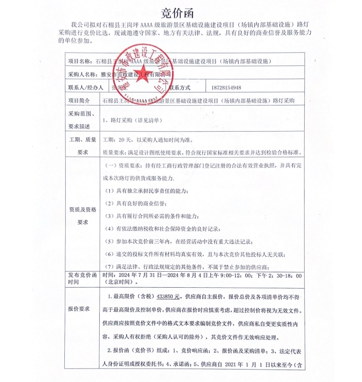 石棉縣王崗坪AAAA級(jí)旅游景區(qū)基礎(chǔ)設(shè)施建設(shè)項(xiàng)目(場鎮(zhèn)內(nèi)部基礎(chǔ)設(shè)施)路燈采購競價(jià)公告