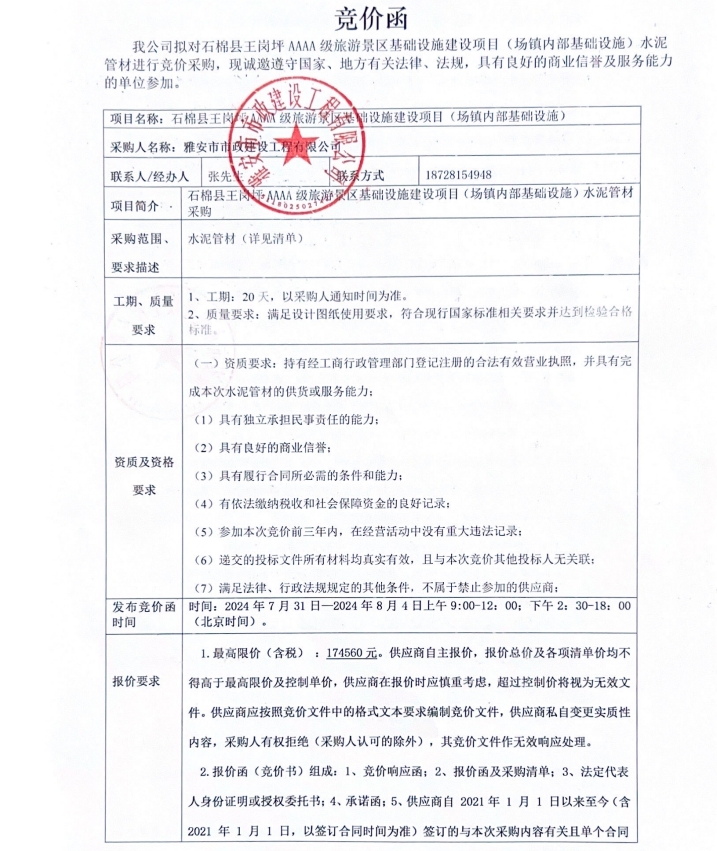 石棉縣王崗坪AAAA級旅游景區(qū)基礎設施建設項目(場鎮(zhèn)內部基礎設施)水泥管材采購競價公告