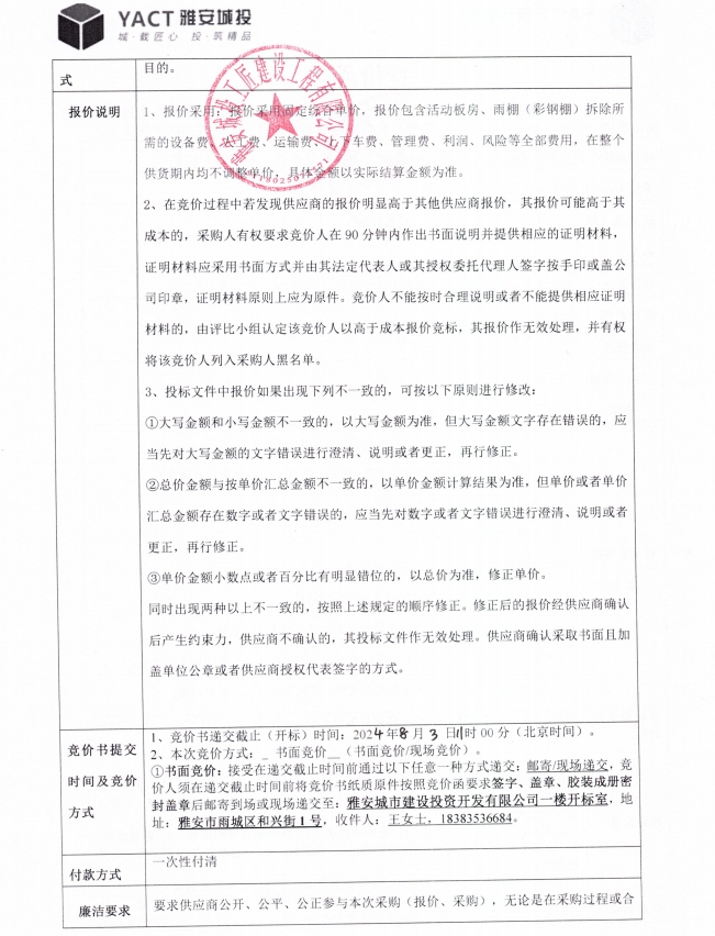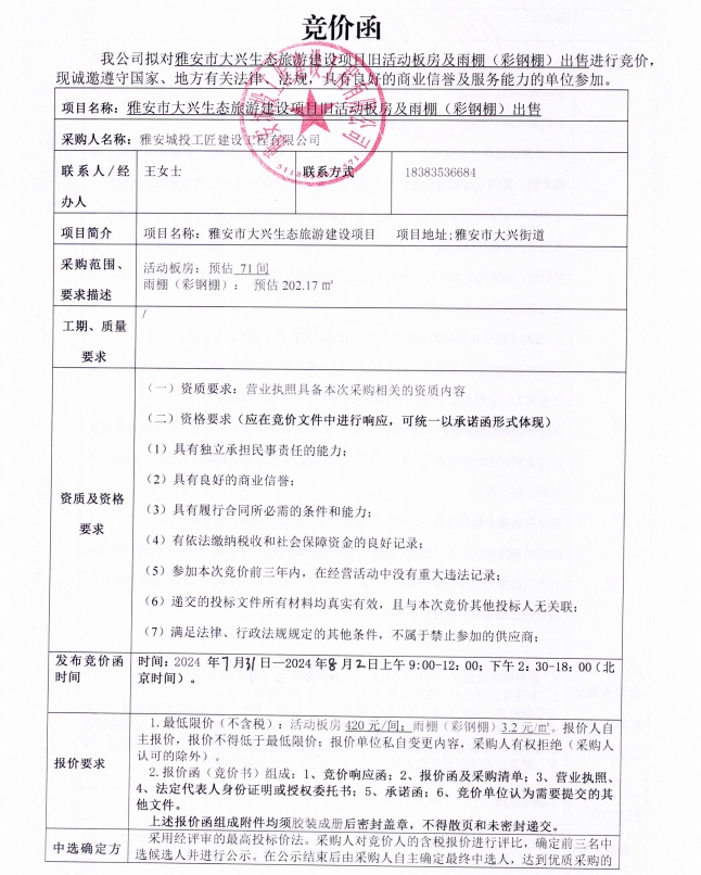附件2:雅安市大興生態(tài)旅游建設(shè)項(xiàng)目舊活動(dòng)板房出售競價(jià)函